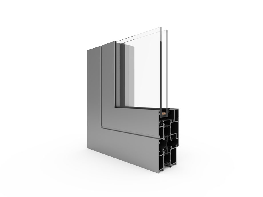 CS 77 ist ein Aluminiumsystem mit thermischer Trennung, das Design und hohen thermischen Komfort mit optimaler Sicherheit verbindet. Es ist auch mit einem versetzten T-Rahmen (ohne Nase) erhältlich.
