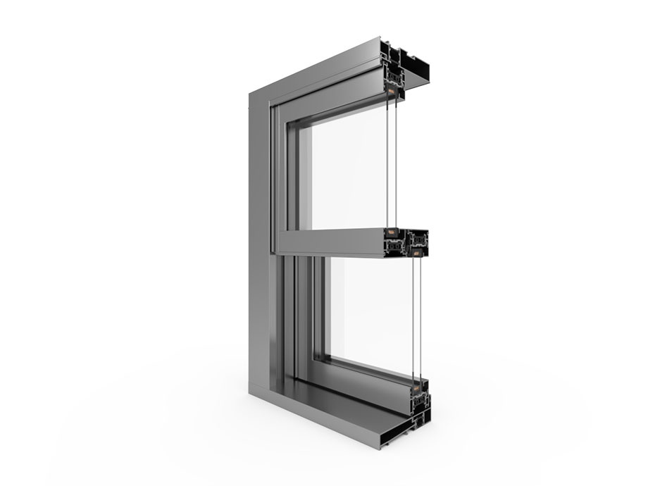 System zum Bau von Hebefensterkonstruktionen, speziell für den amerikanischen und britischen Markt. Das System hat einen eigenen Mechanismus von Beschlägen mit Federn, dank derer können die Flügel nach oben und nach unten verschoben werden können. Die Anwendung eines zusätzlichen Beschlages ermöglicht das Kippen der Flügel zum.